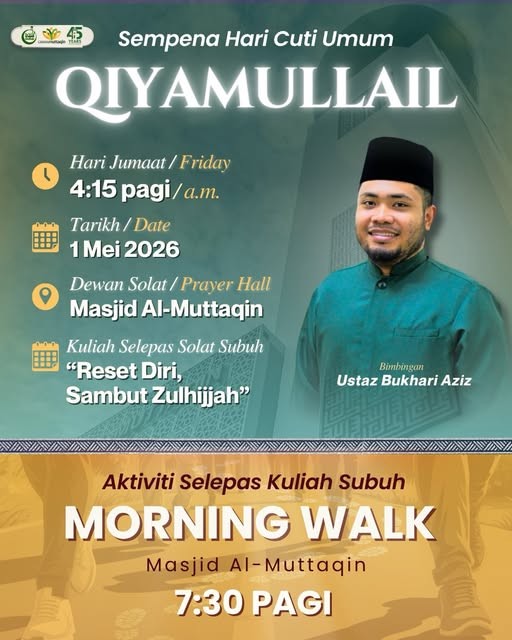 Sertai Qiyamullail pada Jumaat, 1 Mei 2026, 4:15 pagi di Dewan Solat. Selepas Solat Subuh, ikuti kuliah “Reset Diri, Sambut Zulhijjah” bersama Ustaz Bukhari Aziz.